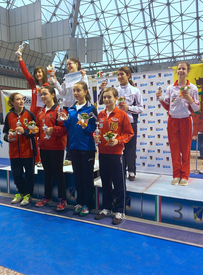 Per il terzo anno consecutivo la sede dei Campionati Italiani U-14 di Scherma si sono disputati nel nuovissimo impianto di Riccione denominato Play Hall, questo a causa dei numeri considerevolmente aumentati ( più di 3.300 iscritti!) degli schermidori partecipanti a questa che è stata l’edizione numero 52 della manifestazione dedicata alle categorie giovanili per le tre specialità del Fioretto, della Sciabola e della Spada Maschile e Femminile e che pertanto hanno fatto diventare “stretta” la classica location del Pala 105 di Rimini! Il Circolo Scherma Castelfranco Veneto A.S.D. ha come sempre schierato molti dei suoi atleti che durante la Stagione 2014/2015 avevano acquisito il merito, in base alle gare di qualifica a cui avevano preso parte, di potervi partecipare per le due specialità praticate nella Sala Scherma castellana, ovvero quelle del Fioretto e della Spada. Nei sette giorni di gare tra tutte le categorie Under-14 (dal 2004 al 2001) – come pocanzi detto – quasi quattromila ragazzi sono scesi sul parterre della bellissima struttura. Anche in questa edizione, come nel passato, la Scherma Castelfranco Veneto ha cercato di far risuonare alta la sua voce in campo nazionale! Il miglior risultato è arrivato da Eleonora Santi - classe 2003 – che in una gara veramente affollata (141 iscritte) è riuscita con abilità e decisione ad arrivare imperiosamente fino ai quarti di finale dove è purtroppo inciampata sulla coriacea romana Brini (poi fra le prime in